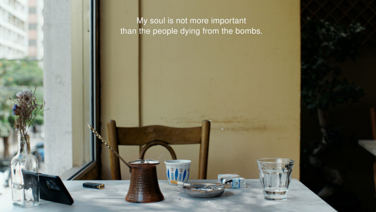 Shot in Beirut, with some of the crew forced to work remotely from New York, the film captures the backdrop of the city, where the muffled noises of the tensions resonate. A few hours after the filming, the bombardments intensified. Between presence and absence, the words of Issa echo beyond the screen with an unrelenting political acuity.