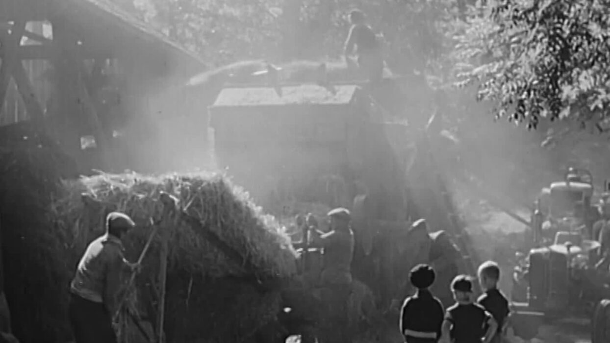 It is threshing day in Langogne: men fill bags of grain and store straw in the barn, while women prepare meals in the farmhouse.