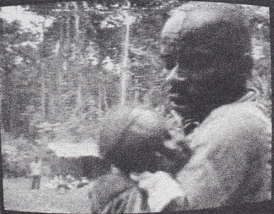 Dans un village pygmée, un père Aka chante une berceuse à son bébé tandis que les mères vaquent à leurs occupations.