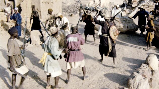 Le doyen du village de Bongo au Mali, mort à 122 ans, était le chef de la Société des masques. Les hommes viennent des villages avoisinants, se livrer à des simulacres de combats au fusil à pierre, à la lance, à l’arc. Le grand masque de Bongo est dressé devant la caverne des masques. Après avoir récité les devises ritualisées du vieil Anaï hommes et femmes de Bongo dansent et pleurent.
